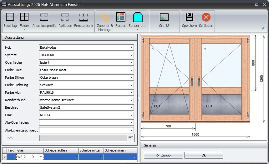 Die neue Tabellensicht (Felder/Gläser) bietet jetzt mehr Übersicht und Zuordnung von Feldern mit abweichenden Scheibenaufbau. Die Visualiserung des Glasaufbau erfolgt auch in der grafischen Darstellung des jeweiligen Bauelement.